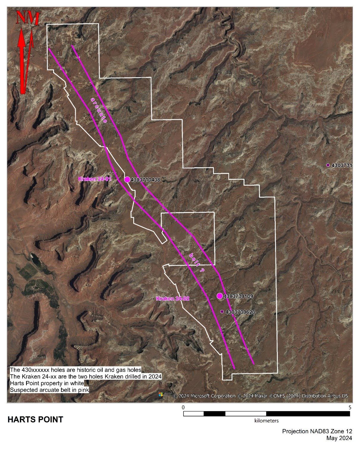 Off-scale radioactivity readings within the Moss Back Member of the Chinle Formation from downhole gamma ray probes of three historic oil and gas holes 4.5 km (2.8 miles) apart led to Atomic's staking of the Harts Point project, as part of the Atomic technical team's assessment of the Paradox Basin for Lisbon Valley analogs. The two hole drilled by Kraken Energy Corp.in 2024 highlighted anomalous down-hole readings in the Moss Back (see 2024-Mar-26 News Release).