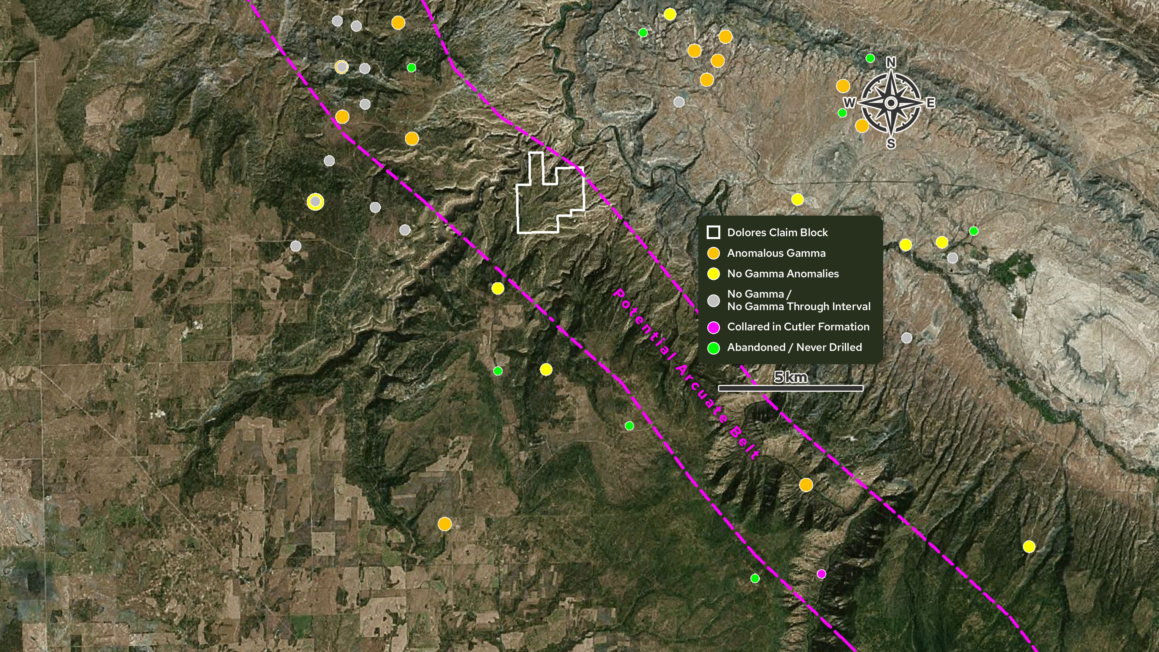 Atomic Minerals staked the Dolores claim block in 2022 targeting both the Chinle Formation and the Morrison Formation at the southern end of the Uravan Mineral Belt. The Uravan Mineral Belt produced 75.5M lbs. of U3O8 and 331.8M lbs. of V2O5 from 1,200 mines in the Salt Wash Member of the Jurassic Morrison Formation between 1947 and 1979.2