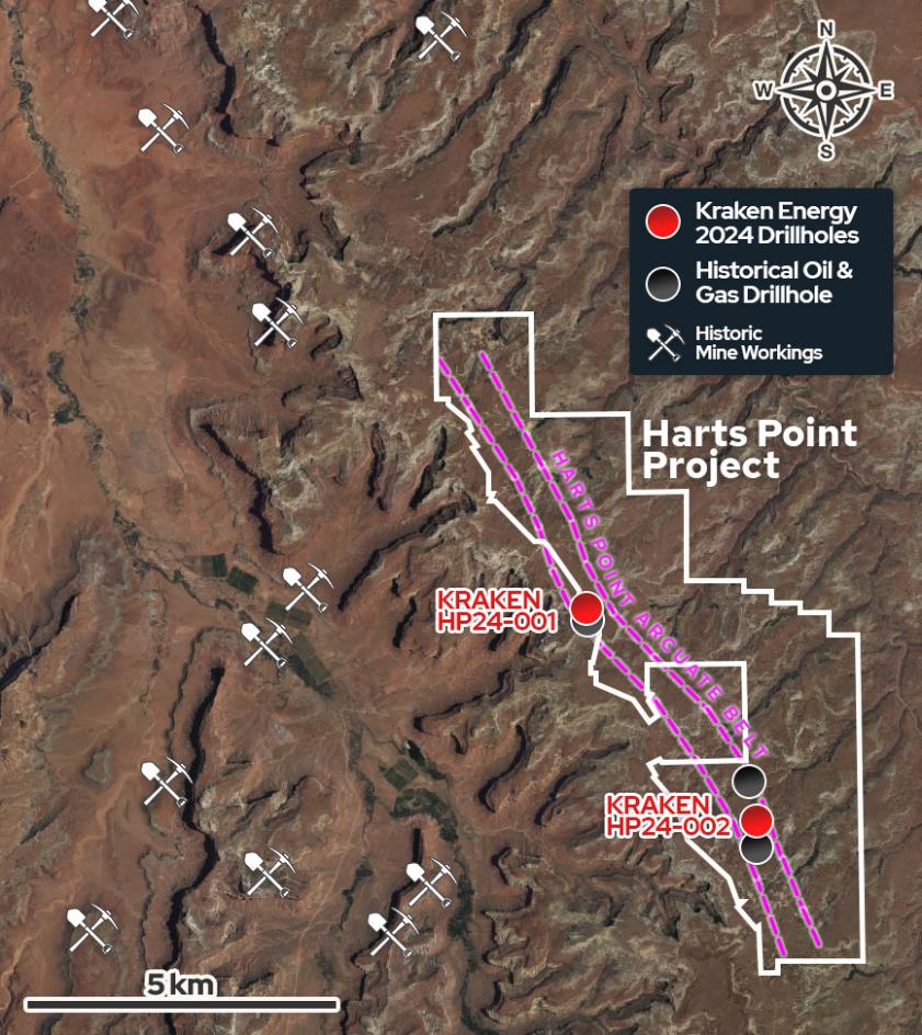 The Harts Point Project consists of 324 claims and covers the flank of the Harts Point anticline, approximately 40 miles by road west of Energy Fuels Inc.'s White Mesa Mill uranium processing facility. Three historic oil and gas holes drilled approximately 2.8 miles apart all located gamma ray log anomalies within the basal portion of the Chinle Formation.