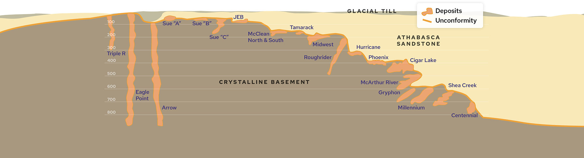 Basement-hosted uranium deposits are a unique and highly valuable mineralization in the Athabasca Basin. These deposits are characterized by their location in close proximity to the unconformity between the older basement rocks and overlying sandstone formations. Notable examples include Fission Uranium’s (TSX: FCU) Triple R deposit and NexGen Energy’s (TSX: NXE) Arrow deposit, which showcase the potential of this deposit type. Basement-hosted uranium deposits represent a promising investment opportunity due to their high-grade nature and exploration potential.