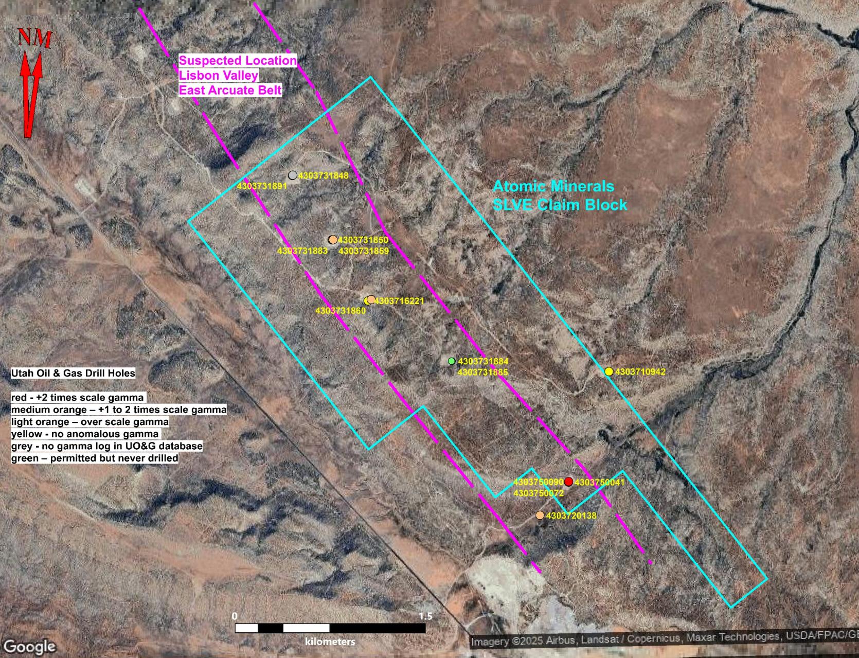 Atomic Minerals’ claims cover the southern ±30% of a suspected down-faulted NE arcuate belt identified through historic oil and gas drilling.